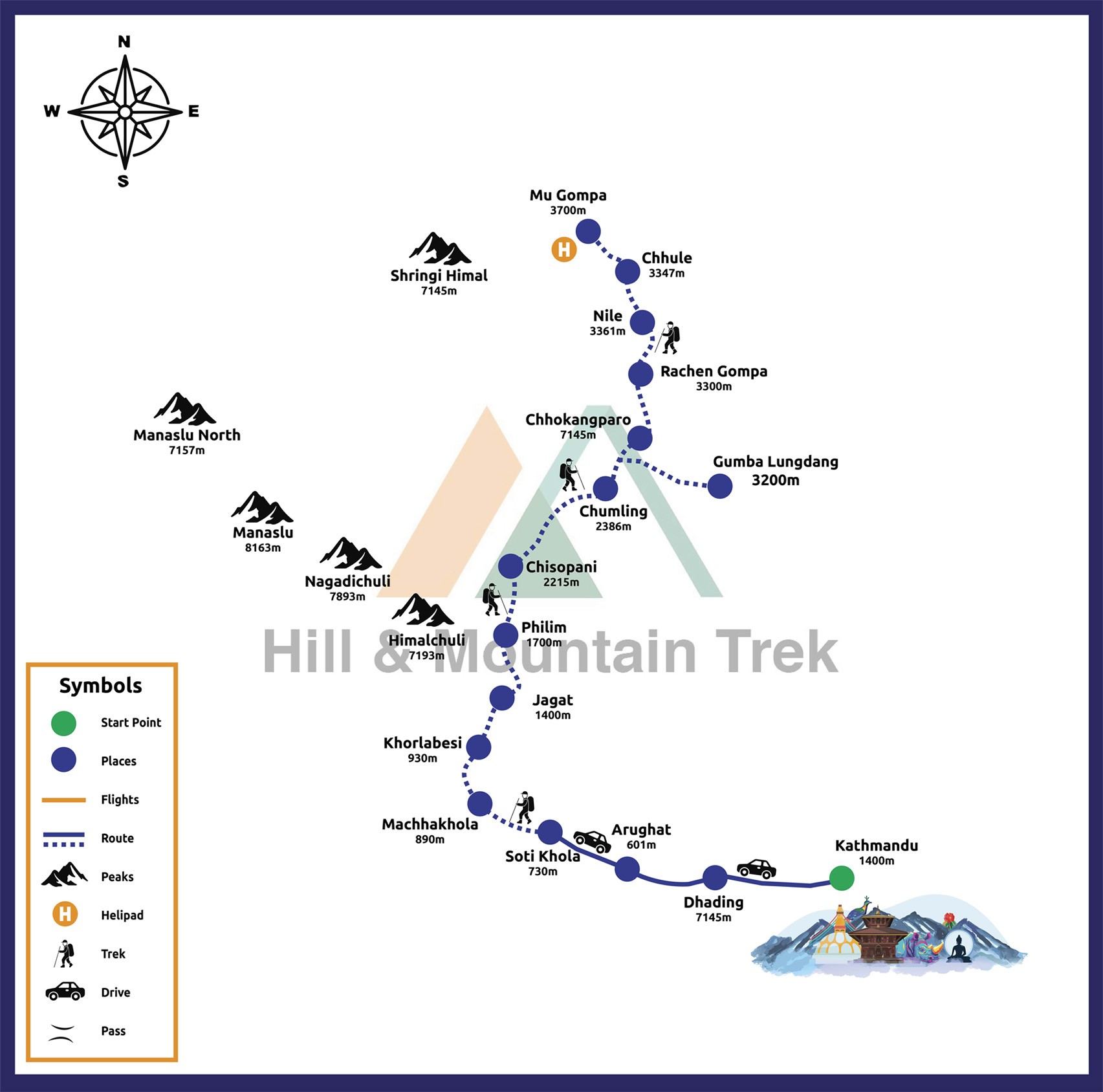 The trek begins and ends in Arughat, located about seven hours by road from Kathmandu. The trail gradually ascends along the Budhi Gandaki River, passing through dense forests, tiered farmlands, and peaceful hill villages. Upon veering off the main Manaslu route into Tsum, a profound sense of entering a hidden, sacred land emerges. The path winds through alpine forests and glacial rivers, with friendly locals offering warm hospitality. Along the way, trekkers will visit picturesque villages such as Liding, Machhakhola, Jagat, and Philim, and explore historic monasteries like Rachen Gompa, Mu Gompa, and Dephyudonma Gompa.