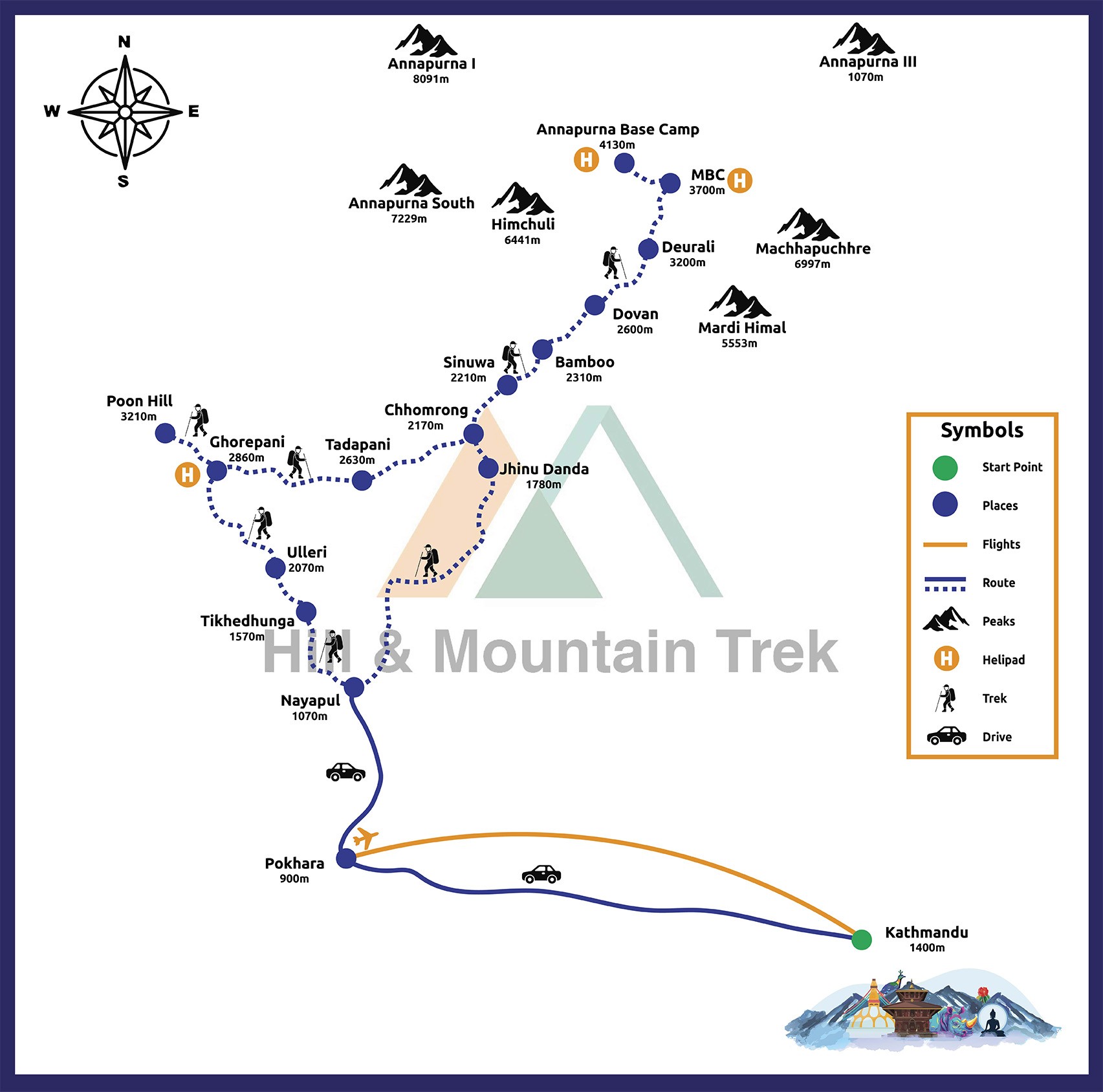 While passing through fascinating villages you will experience terraced farmland, giving an insight into how the locals of this area live. It also winds through rhodondren forests, passes over glacier, rivers and waterfall that allow spectacular views of sheer cliffs with rivers running below. And of course the Himalayan provides an awe- inspiring backdrop! With the highest altitude being 4130 at Annapurna Base Camp, and a steady but gentle increase in altitude in days proceeding, there is little likelihood of altitude- related problems.