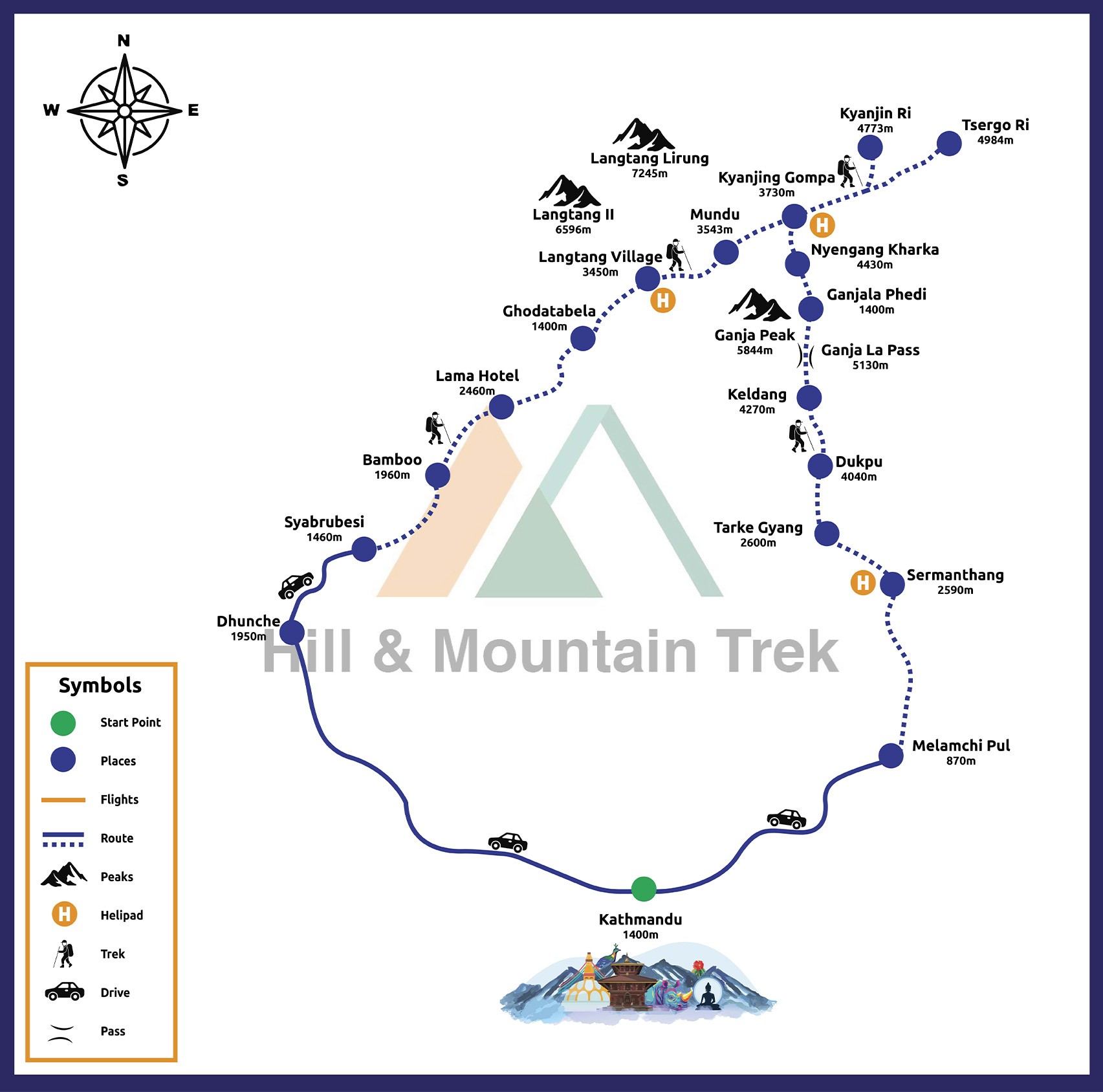 The journey kicks off with a scenic bus ride from Kathmandu to Syabrubesi. From there, the trek begins passing through Kyanjin Gompa, crossing the formidable Ganja La Pass, and concluding at Melamchi Pul Bazar in the Helambu region. As the trek nears its end, you'll wander through picturesque rice terraces and visit beautiful Buddhist monasteries nestled in the charming villages of Tarke Gyang and Sermathang, before returning to Kathmandu.