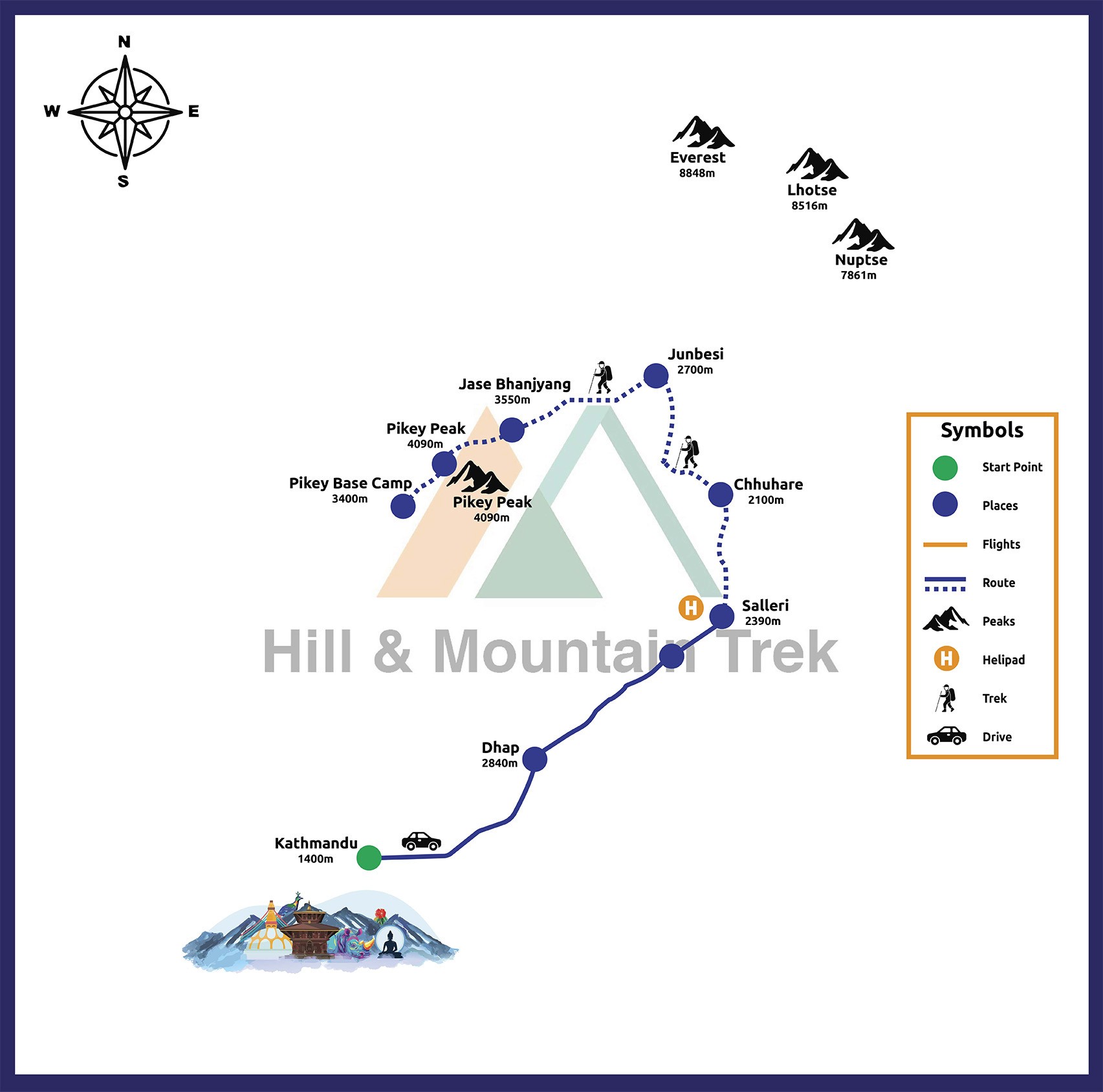 Upon arrival at Tribhuvan International Airport, you are warmly welcomed and transferred to your hotel in Kathmandu. After checking in, you meet your trekking guide for a detailed briefing about the Pikey Peak trek, including safety tips, itinerary, and cultural insights. The rest of the day is free to explore Thamel, purchase trekking essentials, or relax and acclimatize to Nepal’s vibrant atmosphere. Enjoy the evening in the lively streets filled with restaurants, shops, and cafes.