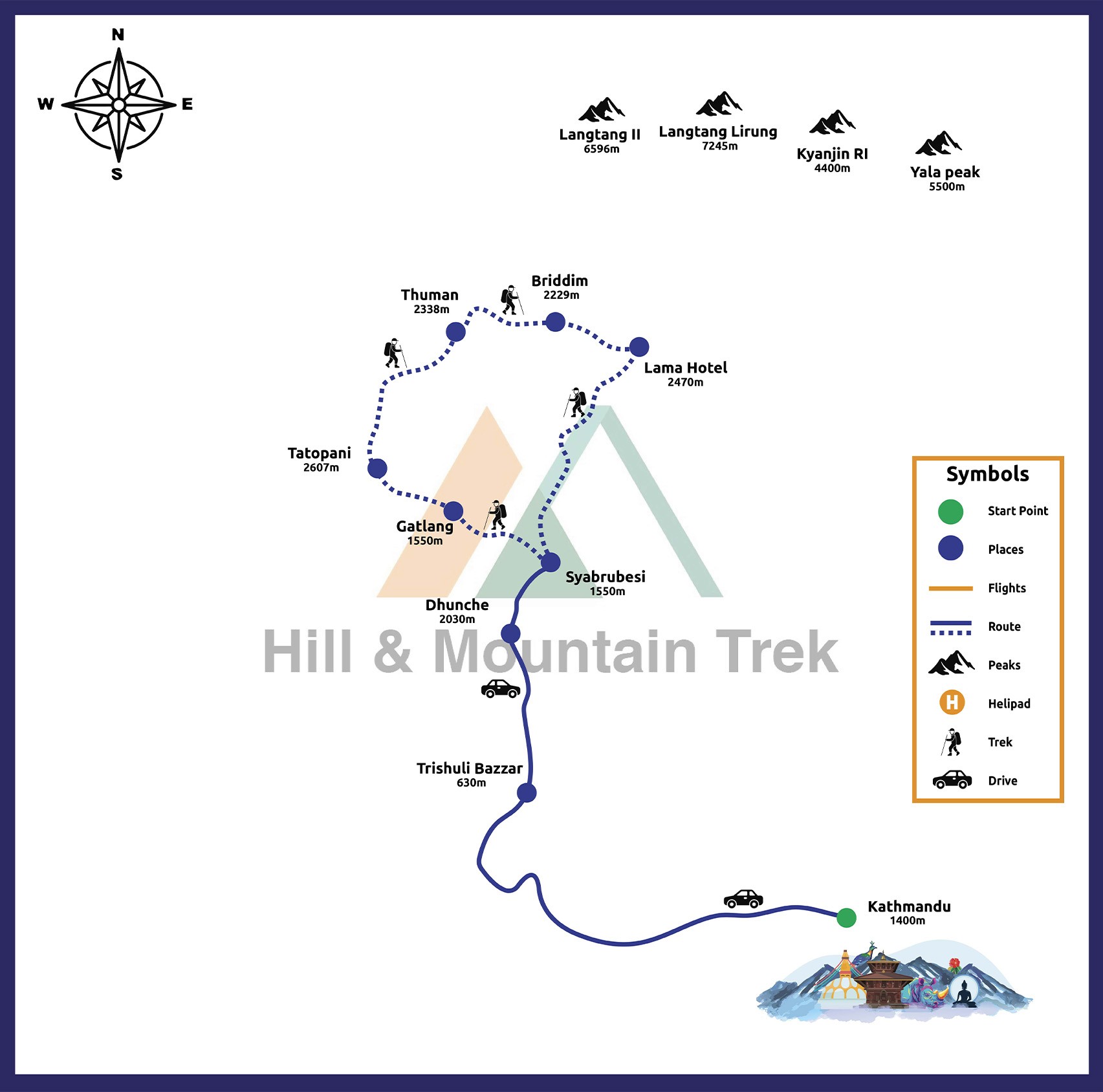 The Tamang Heritage Trek typically starts from Syabrubesi, which is easily accessible from Kathmandu, and follows a circular route through various Tamang villages like Gatlang, Tatopani, Thuman, and Briddim before returning to Syabrubesi. The trek is usually moderate in difficulty, making it suitable for trekkers of various skill levels.